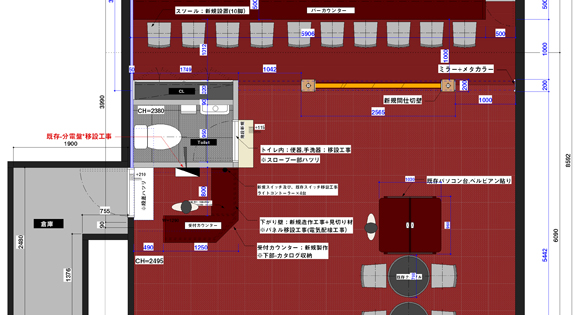 - 納期が特に短い中で、オーナーの意向が大きく反映される案件として、いかに空間・動線・レイアウトを展開できるかに集中致しました。場所は博多駅前の通りにあり、施工期間中近隣住民様への配慮、対応も施工管理の一つだと考えております。結果、お客様に大変満足頂けるものとなりました。